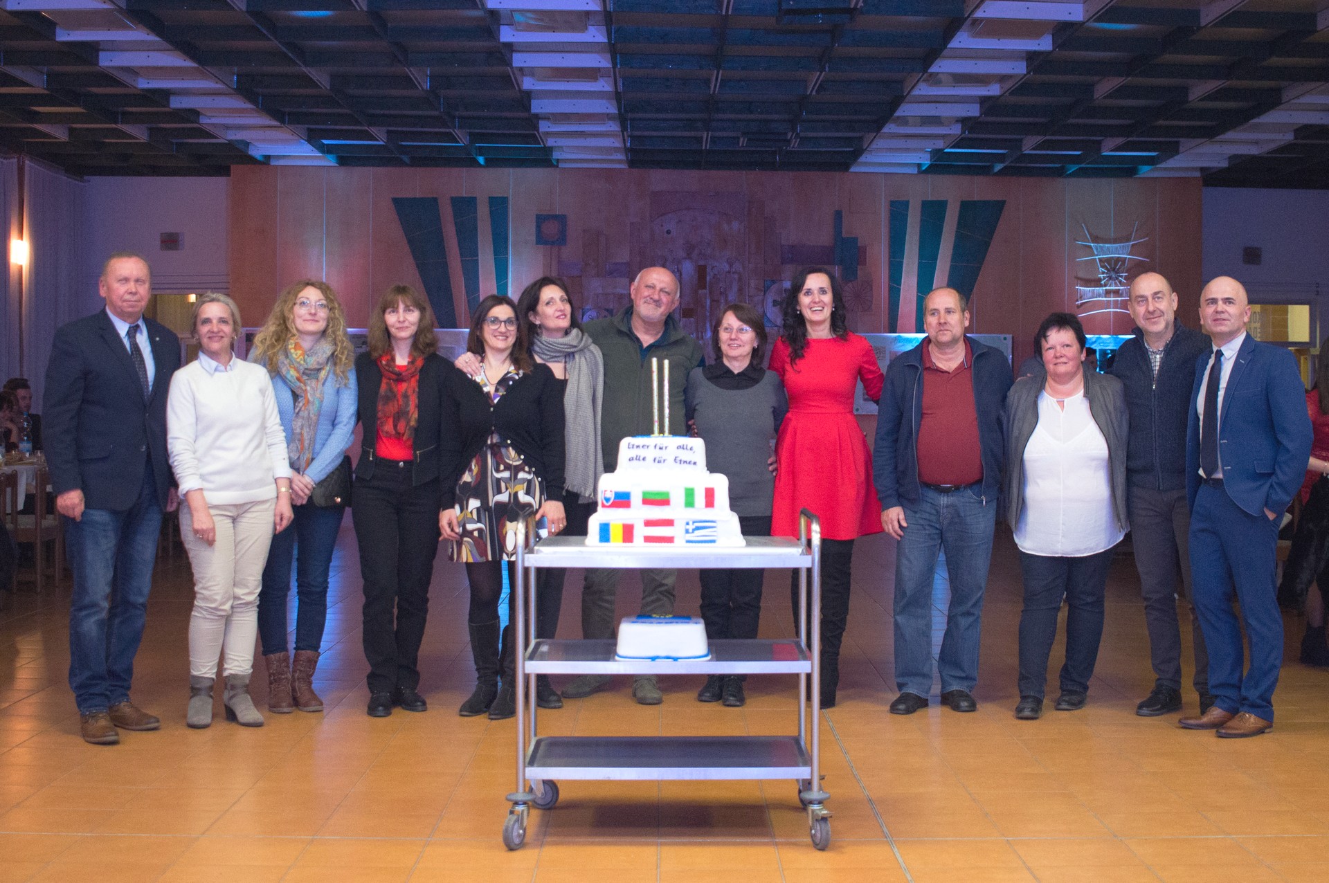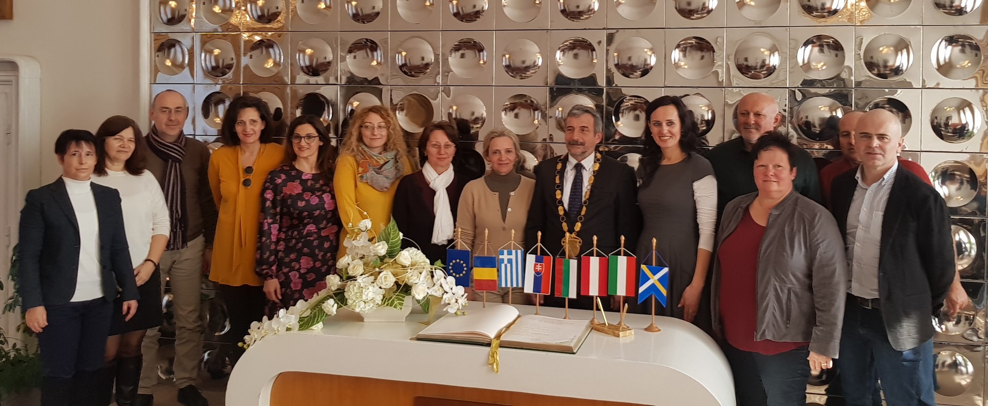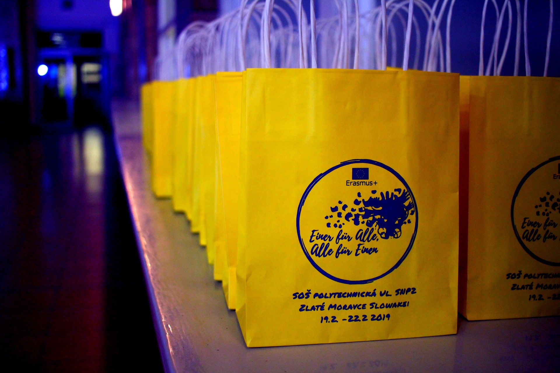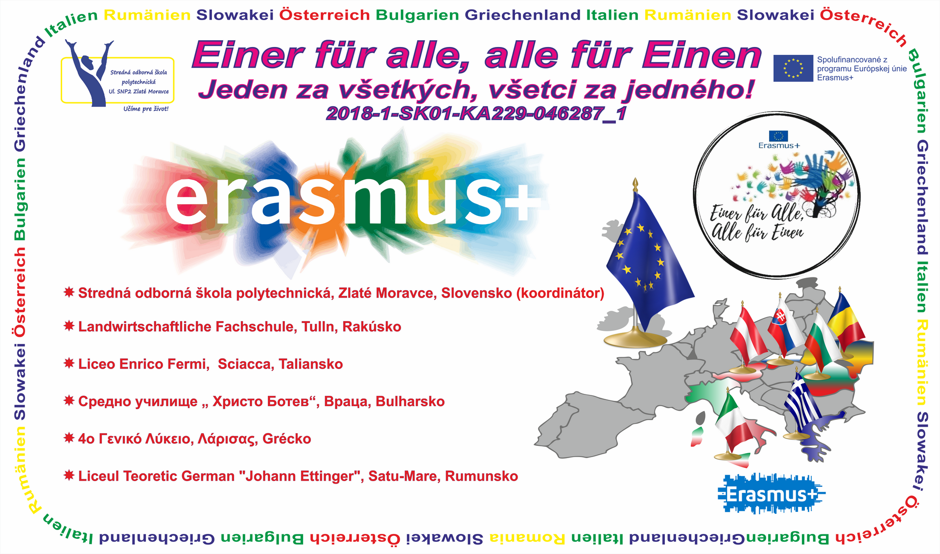 Druhé stretnutie s partnermi z rakúskeho Tullnu, bulharskej Vratsi, gréckej Larissi, rumunskeho Satu-Mare (hist. Satmár), a sicílskej Sciacci sme na našej škole absolvovali v termíne 19. – 22. februára. Toto stretnutie bolo zároveň druhým takýmto stretnutím v poradí v projekte a nasledovalo po stretnutí v Bulharsku. Privítali sme na ňom spolu 25 študentov a 11 sprevádzajúcich učiteľov. V projekte pod názvom „Einer für alle, alle für Einen!“ – po slovensky: „Jeden za všetkých, všetci za jedného!“ je hlavným motívom pomoc dobrovoľníckym organizáciám v regiónoch Európy a zároveň zlepšenie sa v cudzích jazykoch.