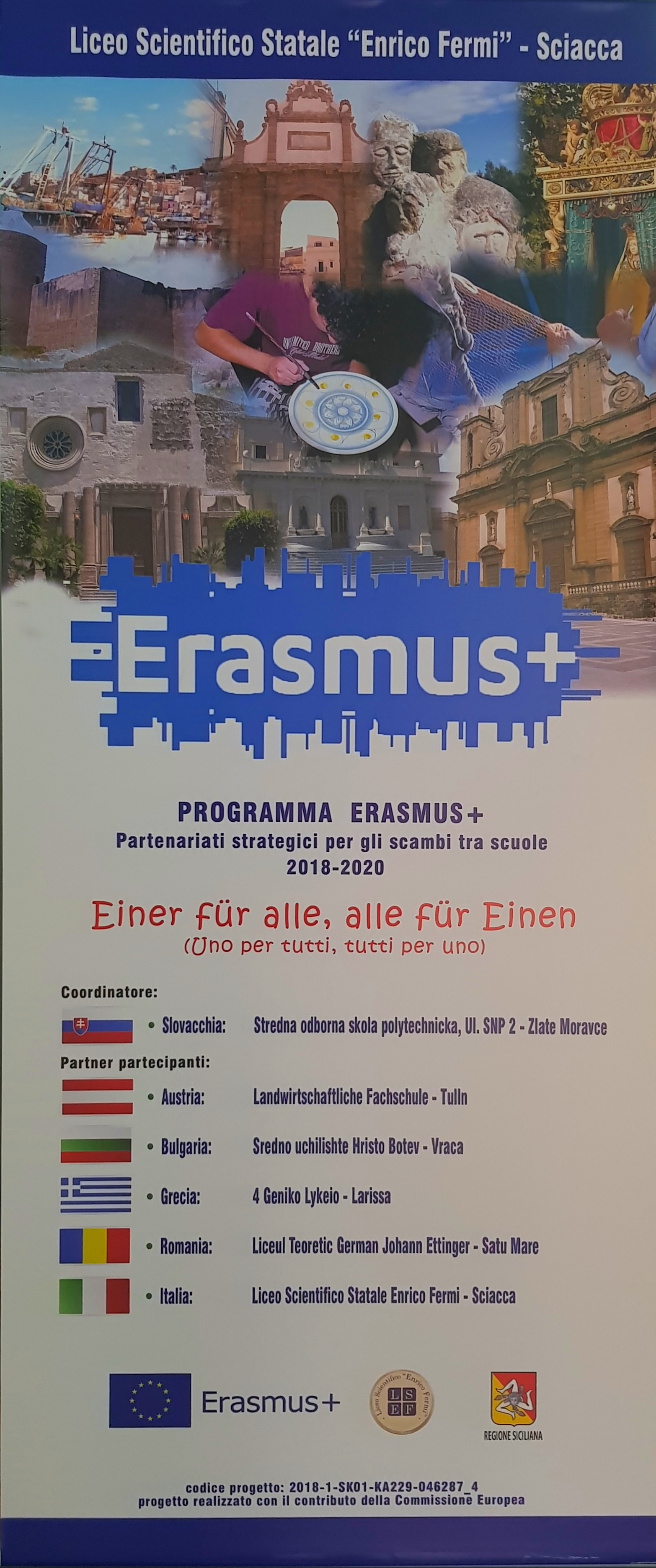 V rámci programu ERASMUS+, kľúčovej aktivity KA2 školské partnerstvá, získala SOŠ polytechnická v Zlatých Moravciach GRANT na realizáciu projektu „Einer für alle, alle für Einen” – “Jeden za všetkých, všetci za jedného”. Grant v celkovej výške 197.958€ sme si rozdelili s partnermi z Rakúska, Talianska, Grécka Rumunska a Bulharska. Tento grant umožní žiakom a učiteľom školy a partnerských škôl spolupracovať oblasti jazykov, všeobecného, ale aj odborného vzdelávania v období rokov 2018 – 2020. Počas tohto obdobia pocestuje spolu 25 študentov z SOŠ polytechnickej Zlaté Moravce na mobility na naše partnerské školy v rakúskom Tullne, sicílskej Sciacce, gréckej Larisse, rumunskej Satu-Mare a bulharskej Vratse. Mobility su plne hradené z prostriedkov Europskeho spoločenstva.